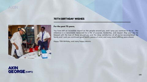 Forthepast70years,Youhaveleftanincredibleimpactonthepeoplearoundyou,andIprayyoucontinuetodoso.Thismilestoneisaremarkabletestamenttoalifeofpurpose,leadership,andimpact.Mayyourdaybeblessedwiththeloveofthosearoundyouandthedeepsatisfactionofallyou%u2019veaccomplished.MyfamilyandIwishyoucontinuedgoodhealth,peaceofmind,andmanymorefulfillingyearsahead.Happy70thBirthday,andmanyhappyreturns.70THBIRTHDAYWISHESAKINGEORGE(CAPT.)AKIN106