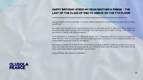 Havingblazedatrailasapioneerinsomanyfieldsofendeavourwecanfinallysayyou%u2019relastatdoingsomething!Ourpathscriss-crossedonsomanyoccasionsandnotoncedidyoufailtoaddvalue.Whatmakesyouanoutstandingfellowareyourgiftofforesight,thesolidadviceyou%u2019reabletobringtothetableandyourabilitytodeliverwithclinicalprecision!Yourwillingnesstochallengethestatusquowithoutfearislegendaryandyourconcern&supportforthosethatyoucomeacross,especiallytheyoungergeneration,placesyouinanexceptionalpositionasaremarkablebeingandamanforallseasons.Thebeautyofbeing70isthatit%u2019stheonebirthdayyou%u2019repermittedtocelebrateexactlythewayyouwant.Nodoubtyouwilldososurroundedbyyourfamily&lovedones.Myprayeristhattherewillbemanymoreyearsaheadingoodhealth&goodcheer!HappyBirthday,BestWishes&GodBless!HAPPYBIRTHDAYATEDOMYDEARBROTHER&FRIEND-THELASTOFTHECLASSOF1966TOARRIVEONTHE7THFLOOR!OLUSOLA107OLUSOLAPEARCE