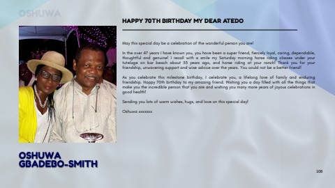 Maythisspecialdaybeacelebrationofthewonderfulpersonyouare!Intheover47yearsIhaveknownyou,youhavebeenasuperfriend,fiercelyloyal,caring,dependable,thoughtfulandgenuine!IrecallwithasmilemySaturdaymorninghorseridingclassesunderyourtutelageonbarbeachabout33yearsago,andhorseridingatyourranch!Thankyouforyourfriendship,unwaveringsupportandwiseadviceovertheyears.Youcouldnotbeabetterfriend!Asyoucelebratethismilestonebirthday,Icelebrateyou,alifelongloveoffamilyandenduringfriendship.Happy70thbirthdaytomyamazingfriend.Wishingyouadayfilledwithallthethingsthatmakeyoutheincrediblepersonthatyouareandwishingyoumanymoreyearsofjoyouscelebrationsingoodhealth!Sendingyoulotsofwarmwishes,hugs,andloveonthisspecialday!OshuwaxxxxxxxOSHUWAGBADEBO-SMITHOSHUWA108HAPPY70THBIRTHDAYMYDEARATEDO