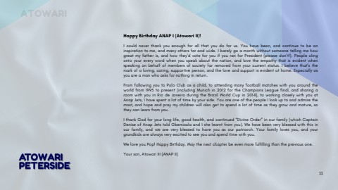 11ATOWARIHappyBirthdayANAPI(AtowariII)!Icouldneverthankyouenoughforallthatyoudoforus.Youhavebeen,andcontinuetobeaninspirationtome,andmanyothersfarandwide.Ibarelygoamonthwithoutsomeonetellingmehowgreatmyfatheris,andhowthey%u2019dvoteforyouifyouranforPresident(pleasedon%u2019t!).Peopleclingontoyoureverywordwhenyouspeakaboutthenation,andlovetheempathythatisevidentwhenspeakingonbehalfofmembersofsocietyfarremovedfromyourcurrentstatus.Ibelievethat%u2019sthemarkofaloving,caring,supportiveperson,andtheloveandsupportisevidentathome.Especiallyasyouareamanwhoasksfornothinginreturn.FromfollowingyoutoPoloClubasachild,toattendingmanyfootballmatcheswithyouaroundtheworldfrom1995topresent(includingMunichin2012fortheChampionsLeaguefinal,andsharingaroomwithyouinRiodeJaneiroduringtheBrazilWorldCupin2014),toworkingcloselywithyouatAnapJets,Ihavespentalotoftimebyyourside.YouareoneofthepeopleIlookuptoandadmirethemost,andhopeandpraymychildrenwillalsogettospendalotoftimeastheygrowandmature,sotheycanlearnfromyou.IthankGodforyourlonglife,goodhealth,andcontinued%u201cDivineOrder%u201dinourfamily(whichCaptainDeniseofAnapJetstoldGbemisolaandIshelearntfromyou).Wehavebeenveryblessedwiththisinourfamily,andweareveryblessedtohaveyouasourpatriarch.Yourfamilylovesyou,andyourgrandkidsarealwaysveryexcitedtoseeyouandspendtimewithyou.WeloveyouPop!HappyBirthday.Maythenextchapterbeevenmorefulfillingthanthepreviousone.Yourson,AtowariIII(ANAPII)ATOWARIPETERSIDE