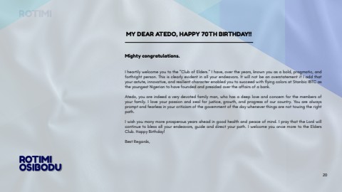 Mightycongratulations.Iheartilywelcomeyoutothe\forthrightperson.Thisisclearlyevidentinallyourendeavors.ItwillnotbeanoverstatementifIaddthatyourastute,innovative,andresilientcharacterenabledyoutosucceedwithflyingcolorsatStanbicIBTCastheyoungestNigeriantohavefoundedandpresidedovertheaffairsofabank.Atedo,youareindeedaverydevotedfamilyman,whohasadeeploveandconcernforthemembersofyourfamily.Iloveyourpassionandzealforjustice,growth,andprogressofourcountry.Youarealwayspromptandfearlessinyourcriticismofthegovernmentofthedaywheneverthingsarenottowingtherightpath.Iwishyoumanymoreprosperousyearsaheadingoodhealthandpeaceofmind.IpraythattheLordwillcontinuetoblessallyourendeavors,guideanddirectyourpath.IwelcomeyouoncemoretotheEldersClub.HappyBirthday!BestRegards,ROTIMIOSIBODUROTIMIMYDEARATEDO,HAPPY70THBIRTHDAY!!20