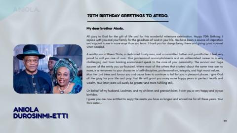 MydearbrotherAtedo,AllglorytoGodforthegiftoflifeandforthiswonderfulmilestonecelebration.Happy70thBirthday.IrejoicewithyouandyourfamilyforthegoodnessofGodinyourlife.Youhavebeenasourceofinspirationandsupporttomeinmorewaysthanyouknow.Ithankyouforalwaysbeingthereandgivinggoodcounselwhenneeded.AworthysonofRiversState,adedicatedfamilyman,andacommittedfatherandgrandfather.Ifeelveryproudtocallyouoneofours.Yourprofessionalaccomplishmentsandanunblemishedcareerinaverychallengingandtoxicbankingenvironmentspeaktothecoreofyourpersonality.Thesurvivalandhugesuccessoftheentityyouco-founded,wheremostoftheothersthatstartedaboutthesametimearenomore,isatestamenttoyourcharacterofself-discipline,professionalism,integrity,andhighmoralvalues.MaytheLordblessandfavouryouandcauselinestocontinuetofallforyouinpleasantplaces.IgiveGodallthegloryforyourlifeandpraythatHewillgrantyoumanymorehappyyearsinperfecthealthandwealth.Yourlateryearswillsurelybegreaterandmorefulfillingstill.Onbehalfofmyhusband,Lookman,andmychildrenandgrandchildren,Iwishyouaveryhappyandjoyousbirthday.Iguessyouarenowentitledtoenjoythesiestayouhavesolongedandenviedmeforalltheseyears.Yourthirdsister...ANIOLA.ANIOLADUROSINMI-ETTI70THBIRTHDAYGREETINGSTOATEDO.22