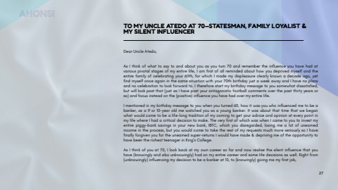 DearUncleAtedo,AsIthinkofwhattosaytoandaboutyouasyouturn70andremembertheinfluenceyouhavehadatvariouspivotalstagesofmyentirelife,Iamfirstofallremindedabouthowyoudeprivedmyselfandtheentirefamilyofcelebratingyour60th,forwhichImademydispleasureclearlyknownadecadeago,yetfindmyselfonceagaininthesamesituationwithyour70thbirthdayjustaweekawayandIhavenoplansandnocelebrationtolookforwardto.Ithereforestartmybirthdaymessagetoyousomewhatdissatisfied,butwilllookpastthat(justasIhavepastyourantagonisticfootballcommentsoverthepastthirtyyearsorso)andfocusinsteadonthe(positive)influenceyouhavehadovermyentirelife.Imentionedinmybirthdaymessagetoyouwhenyouturned60,howitwasyouwhoinfluencedmetobeabanker,asa9or10-yearoldmewatchedyouasayoungbanker.Itwasaboutthattimethatwebeganwhatwouldcometobealife-longtraditionofmycomingtogetyouradviceandopinionateverypointinmylifewhereIhadacriticaldecisiontomake.TheveryfirstofwhichwaswhenIcametoyoutoinvestmyentirepiggy-banksavingsinyournewbank,IBTC,whichyoudisregarded,losingmealotofunearnedincomeintheprocess,butyouwouldcometotaketherestofmyrequestsmuchmoreseriouslysoIhavefinallyforgivenyoufortheunearnedsuper-returnsIwouldhavemade&deprivingmeoftheopportunitytohavebeentherichestteenagerinKing%u2019sCollege.AsIthinkofyouat70,Ilookbackatmyowncareersofarandnowrealisethesilentinfluencethatyouhave(knowinglyandalsounknowingly)hadonmyentirecareerandsomelifedecisionsaswell.Rightfrom(unknowingly)influencingmydecisiontobeabankerat10,to(knowingly)givingmemyfirstjob,TOMYUNCLEATEDOAT70%u2014STATESMAN,FAMILYLOYALIST&MYSILENTINFLUENCER27AHONSI