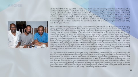 atthethenIBTCattheageof15%u2013IrealisenowthatIwentintouniversity(andthenmyMasters)withaconfidencebelievingthatIhadwhatittooktobeagoodbanker,onlybecauseofmyholidayjobsinIBTC,workingwithactualbankersandIrealisenowthatthisunconsciouslyplayedabigroleintheconfidenceIdisplayedwhenitcametomyCitibankinterview,formyfirstjobasapost-graduate.WhenaskedatthatinterviewbyMichelAccad(thenCitibankNigeriaMD)whyIfeltIwouldmakeagoodbanker,IsimplyansweredbecauseIhadtriedmyhandsatitbeforeandtookhimthroughmyvariousholidayjobsatIBTC.ItislookingbacknowthatIrealisethattheconfidencethata22-yearoldmedisplayedtoabankCEO,wasduetoyourinfluence.WhenImovedbacktoNigeriatobeginmycareeratCitibank,Ilivedwithyou&mydearAuntyDudun(mygistingpartner),asyouobviouslyknow,butyouprobablydonotknowhowmuchIlearntfromourconversationsoverdinnermostevenings.IonlyrealisenowthatinspeakingaboutworkandbankingeveryeveningwiththeownerandCEOoftheforemostinvestment-bankinthecountryatthetime,IwasunknowinglypickingupthingsfarbeyondmycurrentageandjobgradeandthatagainmaypartiallyaccountforwhyIhavebeenfortunateenoughtofindmyselfinboardroomswithinandoutsideNigeria(Chairingsomeofthem)andalsofoundingandrunningmyownbusiness,beforeturning50.Youstartedabankataveryyoungagei.e.at33andIstartedmyownbusiness(PetralonEnergy)at38%u2013Iamoftenaskedthesedays,whatgavemetheconfidenceorforesightorvisiontodaretostartmyownoilandgascompanyatsuchayoungageandI%u2019vehadtothinkaboutitandyoucomeupasoneoftherecurringinfluencesforthatdecisionImade.Itdidnotseemasboldoraudacioustome,havinghadthebenefitofwatchingyourownlifefromsuchacloseviewsoyetagainyourquietinfluencecomestomind.AsIapproachmyownlandmark(turning50onmynextbirthday),Ifindmyselfpre-occupiedrecentlywithhowtosuccessfullytransitionfromrunningabusinessthatrevolveslargelyaroundthefoundertoensuringabusinessthatwillcontinuetothriveafterone%u2019sexitandIfindmyselfonceagainthinkingaboutyouandhowyoumanagedtotransitionfromFounderandCEOofIBTCtoStanbicIBTCthatisthrivingafteryourexitfromthebusinessandsoyoursilentinfluencecontinuesandyou%u2019remostlikelyobliviousofthis.IalsofindmyselfincreasinglythinkingaboutNation-buildingandlegacyandwonderingifitisenoughtocreatepersonalsuccesswhilesurroundedbysomuchunemployment,sufferingandsocial(andmoral)decayallaroundoneandthenitoccurredtome,%u201ccrap,IamthinkinglikeUncleAtedo%u201d.28AHONSI