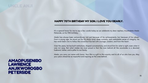 It%u2019saspecialhonorformetosayafewwordstodayaswecelebratemydearnephew,ArusibidaboAtedoPeterside,onhis70thbirthday.Atedohasalwaysbeenextraordinary,notjustbecauseofhisachievements,butbecauseofhisvalues.Fromayoungage,hestoodoutforhissharpmind,deepcuriosity,andunshakablesenseofintegrity.Hehasneverbeenonetofollowthecrowdbuthasledwithcourage,wisdom,andfromtheheart.Overtheyears,hehasbuiltinstitutions,shapedconversations,andstoodfirmforwhatisright,evenwhenitwasnoteasy.Butwhatmakesmemostproudisthatthemanbehindalltheaccoladesisadevotedhusband,father,andapillartoourfamily.Atedo,youcarryournamewithhonor.Yourlifeisagifttothiscountryandtoallofuswholoveyou.Mayyouryearsaheadbeasimpactfulandinspiringastheonesbehind.HAPPY70THBIRTHDAYMYSON.ILOVEYOUDEARLY.AMAOPUSENIBOLAWRENCEANJIKWOROGBOPETERSIDE31UNCLEANJI