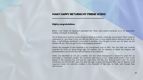 Mightycongratulations.BeforeImetAtedo,hisreputationprecededhim.Therewereseveralnarrativesastohispersonality,intellect,anddepthofcharacter.Oneofthosenot-so-positivenarrativeswasofAtedoassnobbish,unfriendly,andarrogant.WhatIcametounderstandasIgotclosertohimwasthathetookhistimetoknowpeoplebeforeopeninghimselfuptothem.Aself-defensemechanismIhavetriedtoemulate.Oncehegetstoknowyou,heopensupandrelaxeswithyou.Whatyougetisafunandengagingpersonality.ClearlythestrongestofthenarrativesishisfoundationalworkonIBTC.Howthestaffwascarefullyscreened,hisfocusondoingthingsright,hisintellect,andhisattentiontodetail.Hisintegrityandprofessionalismwonhimthetrustandconfidenceofhiscustomers.Atedowasdescribedasnotjustabanker,butonewhosebackgroundineconomicsgavehimanadvantageininvestmentanalysis.ThenarrativeswereheavyonhowAtedocouldpredictwhatwouldhappenintheeconomyfiveandeventenyearsdowntheline.OnethingforsureisthatthestrongfoundationshelaidforIBTCgavethebankthelegstogrowintoStanbicIBTC,oneofNigeria'smostrespectedbanks.Aninstitutionmoldedinhischaracteroflesstalk,noflash,andfocusedhighperformance.UDEME32MANYHAPPYRETURNSMYFRIENDATEDO