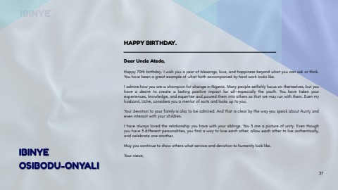 DearUncleAtedo,Happy70thbirthday.Iwishyouayearofblessings,love,andhappinessbeyondwhatyoucanaskorthink.Youhavebeenagreatexampleofwhatfaithaccompaniedbyhardworklookslike.IadmirehowyouareachampionforchangeinNigeria.Manypeopleselfishlyfocusonthemselves,butyouhaveadesiretocreatealastingpositiveimpactforall%u2014especiallytheyouth.Youhavetakenyourexperiences,knowledge,andexpertiseandpouredthemintootherssothatwemayrunwiththem.Evenmyhusband,Uche,considersyouamentorofsortsandlooksuptoyou.Yourdevotiontoyourfamilyisalsotobeadmired.AndthatisclearbythewayyouspeakaboutAuntyandeveninteractwithyourchildren.Ihavealwayslovedtherelationshipyouhavewithyoursiblings.You3areapictureofunity.Eventhoughyouhave3differentpersonalities,youfindawaytoloveeachother,alloweachothertoliveauthentically,andcelebrateoneanother.Mayyoucontinuetoshowotherswhatserviceanddevotiontohumanitylooklike.Yourniece,HAPPYBIRTHDAY.IBINYEOSIBODU-ONYALIIBINYE37