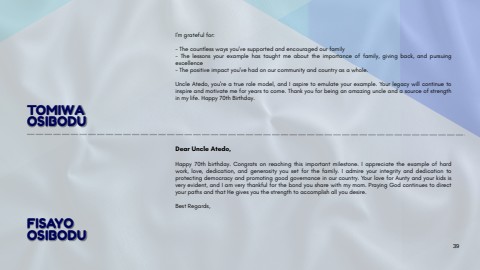 I'mgratefulfor:-Thecountlesswaysyou'vesupportedandencouragedourfamily-Thelessonsyourexamplehastaughtmeabouttheimportanceoffamily,givingback,andpursuingexcellence-Thepositiveimpactyou'vehadonourcommunityandcountryasawhole.UncleAtedo,you'reatruerolemodel,andIaspiretoemulateyourexample.Yourlegacywillcontinuetoinspireandmotivatemeforyearstocome.Thankyouforbeinganamazinguncleandasourceofstrengthinmylife.Happy70thBirthday.TOMIWAOSIBODUDearUncleAtedo,Happy70thbirthday.Congratsonreachingthisimportantmilestone.Iappreciatetheexampleofhardwork,love,dedication,andgenerosityyousetforthefamily.Iadmireyourintegrityanddedicationtoprotectingdemocracyandpromotinggoodgovernanceinourcountry.YourloveforAuntyandyourkidsisveryevident,andIamverythankfulforthebondyousharewithmymom.PrayingGodcontinuestodirectyourpathsandthatHegivesyouthestrengthtoaccomplishallyoudesire.BestRegards,FISAYOOSIBODU39