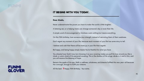 DearAtedo,Neverunderestimatethepoweryouhavetomaketheworldalittlebrighter.Alisteningear,orahelpinghand,canchangesomeone'sdayoreventheirlife.Asimplewordofencouragementorkindnesscostsnothingbutmeanseverything.Onthis70thbirthday,loansomeoneyourstrengthinsteadofremindingthemoftheirweakness.Don'tregretanymomentofyourlife,becauseeachmomentofyourlifehassomestorytotell.Ibelieveandwishthattherewillbemorejoyinyourlifethanregrets.Behappy,andbeinghappysimplymeansYou'rethankfulforwhatyouhave.YoualreadyhaveGod'slove,butchoosingitasyourcoveringmakesyoupullHislovearoundyoulikeacloak%u2014awarmcloakofHispersonalcovering.ThisistheshadowofHiswings;abideinitandinHim,andyouwillreceivetheblessingofhope.RemaintheappleofHiseye.Walkinwellness,wholeness,anddreamsfulfilledthisnewyear%u2014allbecauseHeisenough,enoughtofulfillyourdreams.FUNMAllthebest.%u2763%ufe0fHappy70thBirthday.Yoursister,IGLOVERITBEGINSWITHYOUTODAY.FUNMI41