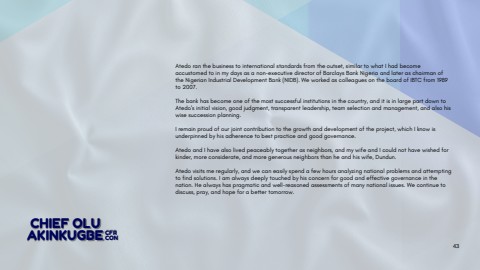 Atedoranthebusinesstointernationalstandardsfromtheoutset,similartowhatIhadbecomeaccustomedtoinmydaysasanon-executivedirectorofBarclaysBankNigeriaandlateraschairmanoftheNigerianIndustrialDevelopmentBank(NIDB).WeworkedascolleaguesontheboardofIBTCfrom1989to2007.Thebankhasbecomeoneofthemostsuccessfulinstitutionsinthecountry,anditisinlargepartdowntoAtedo'sinitialvision,goodjudgment,transparentleadership,teamselectionandmanagement,andalsohiswisesuccessionplanning.Iremainproudofourjointcontributiontothegrowthanddevelopmentoftheproject,whichIknowisunderpinnedbyhisadherencetobestpracticeandgoodgovernance.AtedoandIhavealsolivedpeaceablytogetherasneighbors,andmywifeandIcouldnothavewishedforkinder,moreconsiderate,andmoregenerousneighborsthanheandhiswife,Dundun.Atedovisitsmeregularly,andwecaneasilyspendafewhoursanalyzingnationalproblemsandattemptingtofindsolutions.Iamalwaysdeeplytouchedbyhisconcernforgoodandeffectivegovernanceinthenation.Healwayshaspragmaticandwell-reasonedassessmentsofmanynationalissues.Wecontinuetodiscuss,pray,andhopeforabettertomorrow.CHIEFOLUAKINKUGBECFRCON43