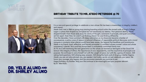 Itisarareandspecialprivilegetocelebrateamanwhoselifehasbeenamasterclassinintegrity,intellect,andimpact.AtedoandImetin1966asyoungboysstartingboardingschoolwithinthestoriedwallsofKing%u2019sCollegeLagos%u2014aplacethatshapedourdisciplinebutnotnecessarilyourdestiny.Thatpersonaldestiny,Atedoshapedhimself.Fromthoseearlydays,hisclarityofthought,commandofprinciple,andquietconvictionsethimapart.Eventhen,hewasn%u2019tjustthinkingahead%u2014hewasthinkingdifferently.Overthedecades,Ihavewatchedwithdeepadmirationasmyclassmatebecameabankerofconsequence,apolicyvoiceofreason,anationalinfluencerofresponsiblepoliticaldiscourse,andamoralcompassinmomentswhensilencewouldhavebeeneasier.Butbeyondtheheadlinesandboardrooms,Atedoismyfriend%u2014loyal,reflective,andfiercelyprincipled.AconfidantwhosecounselIvalueandwhoseconsistencyIcherish.Heisandhasalwaysbeenaconsistentlycommittedfamilyman.At70,heisstillmentoringthenextgenerationonthevalueswelearnedasteenagersattheGoodOldSchool%u2014theintegrityofethics,theimportanceofcivicresponsibility,andtheimperativeofprincipleandpurpose.Hecontinuestocarryhimselfnotwiththeweightofyears,butwiththeurgencyofmission.Stillaskinghardquestions.Stillrefusingeasyanswers.StilldoingthehardworkofshapingabetterNigeria.Atedo,youarenotonlyadmired%u2014youareneeded.Andtoday,wedonotjustcelebrateyouryears.Wehonoryourcourage,yourlegacy,andtheuncommonexampleyoucontinuetoset.Happybirthday,mybrother.Mayyourlifecontinuetobemeaningfulandyourpurposerelevant.ByDr.YeleAluko.BIRTHDAYTRIBUTETOMR.ATEDOPETERSIDE@70YELESHIRLEYAND48DR.YELEALUKODR.SHIRLEYALUKOAND