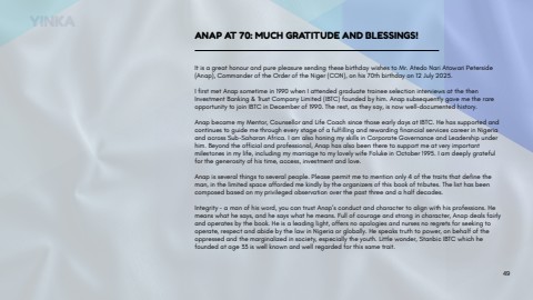 ItisagreathonourandpurepleasuresendingthesebirthdaywishestoMr.AtedoNariAtowariPeterside(Anap),CommanderoftheOrderoftheNiger(CON),onhis70thbirthdayon12July2025.IfirstmetAnapsometimein1990whenIattendedgraduatetraineeselectioninterviewsatthethenInvestmentBanking&TrustCompanyLimited(IBTC)foundedbyhim.AnapsubsequentlygavemetherareopportunitytojoinIBTCinDecemberof1990.Therest,astheysay,isnowwell-documentedhistory.AnapbecamemyMentor,CounsellorandLifeCoachsincethoseearlydaysatIBTC.HehassupportedandcontinuestoguidemethrougheverystageofafulfillingandrewardingfinancialservicescareerinNigeriaandacrossSub-SaharanAfrica.IamalsohoningmyskillsinCorporateGovernanceandLeadershipunderhim.Beyondtheofficialandprofessional,Anaphasalsobeentheretosupportmeatveryimportantmilestonesinmylife,includingmymarriagetomylovelywifeFolukeinOctober1995.Iamdeeplygratefulforthegenerosityofhistime,access,investmentandlove.Anapisseveralthingstoseveralpeople.Pleasepermitmetomentiononly4ofthetraitsthatdefinetheman,inthelimitedspaceaffordedmekindlybytheorganizersofthisbookoftributes.Thelisthasbeencomposedbasedonmyprivilegedobservationoverthepastthreeandahalfdecades.Integrity-amanofhisword,youcantrustAnap%u2019sconductandcharactertoalignwithhisprofessions.Hemeanswhathesays,andhesayswhathemeans.Fullofcourageandstrongincharacter,Anapdealsfairlyandoperatesbythebook.Heisaleadinglight,offersnoapologiesandnursesnoregretsforseekingtooperate,respectandabidebythelawinNigeriaorglobally.Hespeakstruthtopower,onbehalfoftheoppressedandthemarginalizedinsociety,especiallytheyouth.Littlewonder,StanbicIBTCwhichhefoundedatage33iswellknownandwellregardedforthissametrait.ANAPAT70:MUCHGRATITUDEANDBLESSINGS!49YINKA