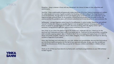50Discipline-Anapisintenseinfocusandverydisciplined.Heisknowntokeeptotime,schedulesandcommitments.Sacrifice%u2013Anapunashamedlyandgenerouslymakessacrificesofhistime,financialresourcesandintellectforwidercausesandsociety.AgoodexampleishisfoundingandsolefundingoftheAnapFoundationCovid-19Committee,throughwhichheledapan-NigeriagroupofeminentmenandwomenfromacrossNigeria%u2019ssixgeo-politicalzones,forthepurposeofsensitizingpolicymakersandthepubliconhowthecountrysurvivedthepandemicyearswithminimalmorbiditiesandlimiteddisruptiontosocio-economiclife.Selflessness-youngerNigeriansadoreAnapforhisselflessness.Anation-builder,Statesmanandpolitical%u201cactivist%u201dofsomesort,AnapisunarguablyNigeria%u2019smostrecognized%u201csponsor%u201dofyoungpeople.HeisknowntospeakforyoungerNigeriansinpublicdiscourse(coveringareaslikedignity,humanrights,economic,voting/politicalrightsandopportunities)sometimestohisownhurt.DearAnap:asyouattaintheplatinumageof70,FolukeandIcelebratewithyou.Ithankyouforthesacrificesandinvestmentsyouhavemadeinmycareerandlife.Thankyouforyoursponsorship,counsellingandinvaluableongoingsupport.SpecialthankstoMrsP.forencouragingandurgingAnapontofulfillhisdivineandearthlymandate.ThankyoualsotoTokini,Gregoire,Atowari,GbemisolaandTariye:forallowingusshareahugepartofyourspace.Anap,MayGodkeepandrichlyblessyou,yourwife,childrenandgrandchildren.WepraythatGodendowsyouwithdivinehealthandpeaceintotherestofyouryearsanddecades.Asyourdaysare,soshallyourstrengthbe(Deuteronomy33:25).Mayyourjoybefull.Mayyourchildrenandchildren%u2019schildrencallyoublessed.ThankyouforallthatyouhavedoneformyfamilyandI,andheartycongratulationsonyour70thbirthday!FondestregardsYINKASANNIYINKA