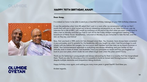 OLUMIDEOYETANDearAnap,Itisindeedanhonortobeabletosendyouaheartfeltbirthdaymessageonyour70thbirthdaymilestone.ItwaslikeyesterdaywhenSolaDBaskedthatIwaitinaroomaftermyconversationwithhersothatIcouldchatwithyouinwhatturnedouttobeaninterestingconversationor,asIlaterfoundout,wasmyinterviewforaroleatIBTC.Lol!IrecallmyconfusionattheendofthechatwhenyousaidIwouldhavetotakeatestonMondayandthatyouhadtorushofffortheFriday4:00pmmanagementmeetingintheboardroomofWeslyHouse.Nonetheless,IreturnedonMondayasyouinstructedtotakethetest,andtherest,astheysay,washistory!Now,thatwasbackin1999,andalothaschangedsincethen.You,however,havealwaysbeenconsistentinyourprinciples,andI%u2019mgratefulfortheleadershipskillsyoutaughtmewhenIhadtheprivilegetoworkcloselywithyoubeforethemergers,firstasajuniorstaffmemberandthenlaterasmyboardchairmaninSIAML.Yourcommonsensicalapproachtoeverythingwasalwaysrefreshing,andyourmatter-of-factattitude,evenintimesofstress,waslaudable.Iloveyourprinciplesonissuesandhowyoulaughedoutloudatyourownjokes,whichmademeandotherslaughevenwhenthejokesweren%u2019tfunny.Thankyouforbelievinginyoungpeopleandalwaysadvocatingfortheminacountrythathasmarginalizedthem.ThankyoualsoforshowingusthatitispossibletobuildanhonestandthrivingbusinessinNigeriadespitemultipleobstaclesandcompetitorstakingshortcuts.Happybirthdayonceagain,andwishingyoumanymoreyearsingreathealth!Godblessyou.Kindestregards,HAPPY70THBIRTHDAY,ANAP!OLUMIDE54