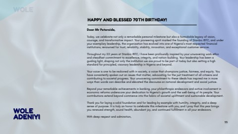 WOLEADENIYIDearMrPeterside,Today,wecelebratenotonlyaremarkablepersonalmilestonebutalsoaformidablelegacyofvision,courage,andtransformativeimpact.YourpioneeringspiritmarkedthefoundingofStanbicIBTC,andunderyourexemplaryleadership,theorganizationhasevolvedintooneofNigeria%u2019smostrespectedfinancialinstitutions,renownedfortrust,reliability,stability,innovation,andexceptionalcustomerservice.Throughoutmy22yearsatStanbicIBTC,Ihavebeenprofoundlyinspiredbyyourunwaveringworkethicandsteadfastcommitmenttoexcellence,integrity,andnation-building.Yourleadershiphasbeenaguidinglight,shapingnotonlytheinstitutionweareproudtobepartoftodaybutalsosettingahighstandardforprincipled,visionaryleadershipinNigeriaandbeyond.Yourvoiceisonetobereckonedwithinsociety,avoicethatchampionsjustice,fairness,andequity.Youhaveconsistentlyspokenoutonissuesthatmatter,advocatingforthejusttreatmentofallcitizensandcontributingtosocietalprogress.Yourunwaveringcommitmenttotheseidealshasinspiredmeinmorewaysthanwordscandescribeandelevatedthediscourseonnationaldevelopmentandsocialjustice.Beyondyourremarkableachievementsinbanking,yourphilanthropicendeavorsandactiveinvolvementineconomicreformsunderscoreyourdedicationtoNigeria%u2019sgrowthandthewell-beingofitspeople.Yourcontributionsextendbeyondcommerceintothefabricofsocietalupliftmentandsustainabledevelopment.Thankyouforlayingasolidfoundationandforleadingbyexamplewithhumility,integrity,andadeepsenseofpurpose.Itistrulyanhonortocelebratethismilestonewithyou,andIpraythatthisyearbringsyourenewedstrength,soundhealth,abundantjoy,andcontinuedfulfillmentinallyourendeavors.Withdeeprespectandadmiration,HAPPYANDBLESSED70THBIRTHDAY!WOLE55