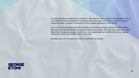 Atapersonallevel,AtedohonoredtheEtomiclanwhenhecametosharehisexperiencewithusatourbiennialEtomiLeadershipConferenceafewyearsago.Hishumilityin-spiteofhisgiantstaturehasbeenasourceofinspirationtotheyoungergenerationofthefamily.Ijoinmywife,EfeandtheentireEtomifamilytowishAtedoahappyandjoyous70thbirthday.WepraythatGodwhohassetyouapartforsignsandwonders,willmakeyourlatteryearsevenbetterthanthepreviousones.IsaluteDudu,yourdependableandfaithfulwifewhosesupportcontinuestomakeyouabetterversionofyourself.GodblessyouandIamproudtocallyoumyfriendandbrother..GEORGEETOMI58