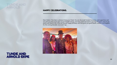 DearAtedo,ithasbeenapleasurebeingyourfriend.Youaredownrighthonest,humorous,andsupportive,andwewishyoumanymoreyearsofgoodhealthandjoy.Youhaveachievedmuchinyourfirst70years,andweareprettysurethereislifeintheolddogyet!Happybirthday,andGodgrantyougoodhealth,wisdom,andlaughterforthecomingdecades.Loveandhugs.TUNDEANDARNOLDEKPEHAPPYCELEBRATIONS.TUNDEANDARNOLD60