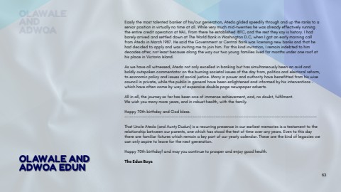 Easilythemosttalentedbankerofhis/ourgeneration,Atedoglidedspeedilythroughanduptherankstoaseniorpositioninvirtuallynotimeatall.Whileverymuchmid-twentieshewasalreadyeffectivelyrunningtheentirecreditoperationatNAL.FromthereheestablishedIBTC,andtheresttheysayishistory.IhadbarelyarrivedandsettleddownatTheWorldBankinWashingtonD.C,whenIgotanearlymorningcallfromAtedoinMarch1987.HesaidtheGovernmentorCentralBankwaslicensingnewbanksandthathehaddecidedtoapplyandwasinvitingmetojoinhim.Forthiskindinvitation,Iremainindebtedtohimdecadesafter,notleastbecausealongthewayourtwoyoungfamilieslivedformonthsunderoneroofathisplaceinVictoriaIsland.Aswehaveallwitnessed,Atedonotonlyexcelledinbankingbuthassimultaneouslybeenanavidandboldlyoutspokencommentatorontheburningsocietalissuesofthedayfrom,politicsandelectoralreform,toeconomicpolicyandissuesofsocialjustice.Manyinpowerandauthorityhavebenefittedfromhiswisecouncilinprivate,whilethepublicingeneralhavebeenenlightenedandinformedbyhisinterventions-whichhaveoftencomebywayofexpensivedoublepagenewspaperadverts.Allinall,thejourneysofarhasbeenoneofimmenseachievement,and,nodoubt,fulfilment.Wewishyoumanymoreyears,andinrobusthealth,withthefamily.Happy70thbirthdayandGodbless.--------------------------------------------------------------------------------------------------------------ThatUncleAtedo(andAuntyDudun)isarecurringpresenceinourearliestmemoriesisatestamenttotherelationshipbetweenourparents,onewhichhasstoodthetestoftimeoveranyyears.Eventothisdaytherearefamiliarfixtureswhichremainakeypartofouryearlycalendar.Thesearethekindoflegacieswecanonlyaspiretoleaveforthenextgeneration.Happy70thbirthday!andmayyoucontinuetoprosperandenjoygoodhealth.OLAWALEANDTheEdunBoysADWOAEDUNOLAWALEANDADWOA63