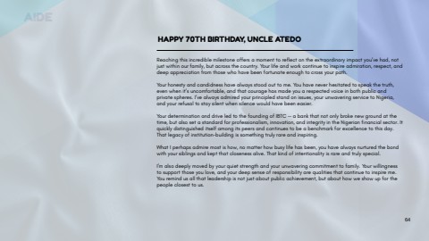 Reachingthisincrediblemilestoneoffersamomenttoreflectontheextraordinaryimpactyou%u2019vehad,notjustwithinourfamily,butacrossthecountry.Yourlifeandworkcontinuetoinspireadmiration,respect,anddeepappreciationfromthosewhohavebeenfortunateenoughtocrossyourpath.Yourhonestyandcandidnesshavealwaysstoodouttome.Youhaveneverhesitatedtospeakthetruth,evenwhenit%u2019suncomfortable,andthatcouragehasmadeyouarespectedvoiceinbothpublicandprivatespheres.I%u2019vealwaysadmiredyourprincipledstandonissues,yourunwaveringservicetoNigeria,andyourrefusaltostaysilentwhensilencewouldhavebeeneasier.YourdeterminationanddriveledtothefoundingofIBTC%u2014abankthatnotonlybrokenewgroundatthetime,butalsosetastandardforprofessionalism,innovation,andintegrityintheNigerianfinancialsector.Itquicklydistinguisheditselfamongitspeersandcontinuestobeabenchmarkforexcellencetothisday.Thatlegacyofinstitution-buildingissomethingtrulyrareandinspiring.WhatIperhapsadmiremostishow,nomatterhowbusylifehasbeen,youhavealwaysnurturedthebondwithyoursiblingsandkeptthatclosenessalive.Thatkindofintentionalityisrareandtrulyspecial.I%u2019malsodeeplymovedbyyourquietstrengthandyourunwaveringcommitmenttofamily.Yourwillingnesstosupportthoseyoulove,andyourdeepsenseofresponsibilityarequalitiesthatcontinuetoinspireme.Youremindusallthatleadershipisnotjustaboutpublicachievement,butabouthowweshowupforthepeopleclosesttous.HAPPY70THBIRTHDAY,UNCLEATEDOAIDE64