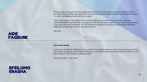 Perhapsmostinspiringofallisthehumilityandsimplicitywithwhichyoucarryyourself.Despiteallyoursuccesses,thesequalitieshaveneverleftyou,aquietdignitythatspeaksvolumeswithoutneedingtoraiseitsvoice.Iamdeeplyproudtocallyoumyuncle.Thankyouforbeingarolemodelinbothwordanddeed.Asyouenterthisnewdecade,Iwishyoucontinuedfulfillment,goodhealth,andpeaceofmind.Maytheyearsaheadbringyouevenmoremomentsofjoy,timewiththoseyoucherish,andthefreedomtospendyourdaysdoingwhatbringsyouthemosthappinessandmeaning.Youhavecertainlyearnedit!Withlove,AIDEFAGBUREDearUncleAtedo,Iwishyouawonderfulcelebrationasyoumarkthisincrediblemilestone.Maythisyearbringyouallthatyourhearttrulydesires,goodhealth,endlessjoy,andmanymorebeautifulmemorieswithallyourlovedones.Cheersto70amazing,trailblazingyears.Verybestwishes...yourniece.EFEILOMOKRAGHA65