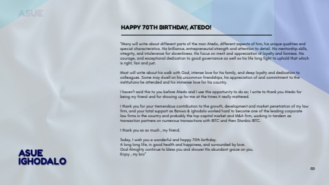 %u201cManywillwriteaboutdifferentpartsofthemanAtedo,differentaspectsofhim,hisuniquequalitiesandspecialcharacteristics.Hisbrilliance,entrepreneurialstrengthandattentiontodetail.Hismentorshipskills,integrity,andintoleranceforslovenliness.Hisfocusonmeritandappreciationofloyaltyandfairness.Hiscourage,andexceptionaldedicationtogoodgovernanceaswellashislifelongfighttoupholdthatwhichisright,fairandjust.MostwillwriteabouthiswalkwithGod,intenseloveforhisfamily,anddeeployaltyanddedicationtocolleagues.Somemaydwellonhisuncommonfriendships,hisappreciationofandcommitmenttotheinstitutionsheattendedandhisimmenseloveforhiscountry.Ihaven%u2019tsaidthistoyoubeforeAtedoandIusethisopportunitytodoso;IwritetothankyouAtedoforbeingmyfriendandforshowingupformeatthetimesitreallymattered.Ithankyouforyourtremendouscontributiontothegrowth,developmentandmarketpenetrationofmylawfirm,andyourtotalsupportasBanwo&IghodaloworkedhardtobecomeoneoftheleadingcorporatelawfirmsinthecountryandprobablythetopcapitalmarketandM&Afirm,workingintandemastransactionpartnersonnumeroustransactionswithIBTCandthenStanbicIBTC.Ithankyousosomuch,myfriend.Today,Iwishyouawonderfulandhappy70thbirthday.Alonglonglife,ingoodhealthandhappiness,andsurroundedbylove.GodAlmightycontinuetoblessyouandshowerHisabundantgraceonyou.Enjoy,mybro%u201dHAPPY70THBIRTHDAY,ATEDO!ASUEIGHODALOASUE69