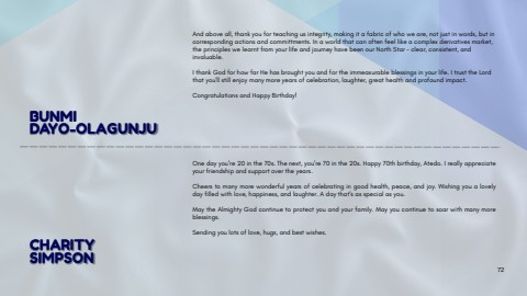 Andaboveall,thankyouforteachingusintegrity,makingitafabricofwhoweare,notjustinwords,butincorrespondingactionsandcommittments.Inaworldthatcanoftenfeellikeacomplexderivativesmarket,theprincipleswelearntfromyourlifeandjourneyhavebeenourNorthStar%u2013clear,consistent,andinvaluable.IthankGodforhowfarHehasbroughtyouandfortheimmeasurableblessingsinyourlife.ItrusttheLordthatyou%u2019llstillenjoymanymoreyearsofcelebration,laughter,greathealthandprofoundimpact.CongratulationsandHappyBirthday!BUNMIDAYO-OLAGUNJU72Onedayyou%u2019re20inthe70s.Thenext,you%u2019re70inthe20s.Happy70thbirthday,Atedo.Ireallyappreciateyourfriendshipandsupportovertheyears.Cheerstomanymorewonderfulyearsofcelebratingingoodhealth,peace,andjoy.Wishingyoualovelydayfilledwithlove,happiness,andlaughter.Adaythat%u2019sasspecialasyou.MaytheAlmightyGodcontinuetoprotectyouandyourfamily.Mayyoucontinuetosoarwithmanymoreblessings.Sendingyoulotsoflove,hugs,andbestwishes.CHARITYSIMPSON
