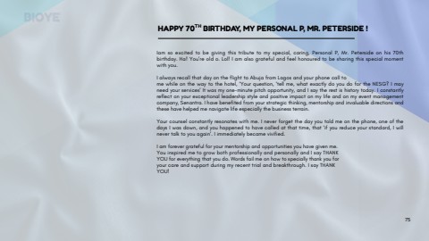 Iamsoexcitedtobegivingthistributetomyspecial,caring,PersonalP,Mr.Petersideonhis70thbirthday.Ha!You%u2019reoldo.Lol!Iamalsogratefulandfeelhonouredtobesharingthisspecialmomentwithyou.IalwaysrecallthatdayontheflighttoAbujafromLagosandyourphonecalltomewhileonthewaytothehotel,%u2018Yourquestion,%u2018tellme,whatexactlydoyoudofortheNESG?Imayneedyourservices%u2019Itwasmyone-minutepitchopportunity,andIsaytherestishistorytoday.Iconstantlyreflectonyourexceptionalleadershipstyleandpositiveimpactonmylifeandonmyeventmanagementcompany,Senantra.Ihavebenefitedfromyourstrategicthinking,mentorshipandinvaluabledirectionsandthesehavehelpedmenavigatelifeespeciallythebusinessterrain.Yourcounselconstantlyresonateswithme.Ineverforgetthedayyoutoldmeonthephone,oneofthedaysIwasdown,andyouhappenedtohavecalledatthattime,that%u2018ifyoureduceyourstandard,Iwillnevertalktoyouagain%u2019.Iimmediatelybecamevivified.Iamforevergratefulforyourmentorshipandopportunitiesyouhavegivenme.YouinspiredmetogrowbothprofessionallyandpersonallyandIsayTHANKYOUforeverythingthatyoudo.Wordsfailmeonhowtospeciallythankyouforyourcareandsupportduringmyrecenttrialandbreakthrough.IsayTHANKYOU!BIOYEHAPPY70BIRTHDAY,MYPERSONALP,MR.PETERSIDE!TH75