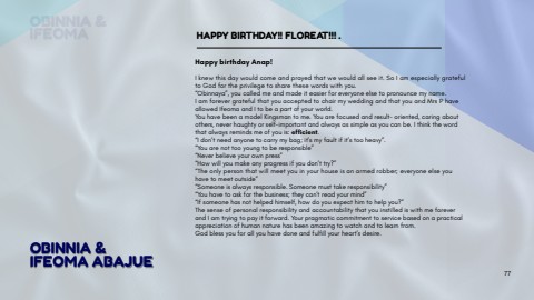 HappybirthdayAnap!Iknewthisdaywouldcomeandprayedthatwewouldallseeit.SoIamespeciallygratefultoGodfortheprivilegetosharethesewordswithyou.%u201cObinnaya%u201d,youcalledmeandmadeiteasierforeveryoneelsetopronouncemyname.IamforevergratefulthatyouacceptedtochairmyweddingandthatyouandMrsPhaveallowedIfeomaandItobeapartofyourworld.YouhavebeenamodelKingsmantome.Youarefocusedandresult-oriented,caringaboutothers,neverhaughtyorself-importantandalwaysassimpleasyoucanbe.Ithinkthewordthatalwaysremindsmeofyouis:efficient.%u201cIdon%u2019tneedanyonetocarrymybag;it%u2019smyfaultifit%u2019stooheavy%u201d.%u201cYouarenottooyoungtoberesponsible%u201d%u201cNeverbelieveyourownpress%u201d%u201cHowwillyoumakeanyprogressifyoudon%u2019ttry?%u201d%u201cTheonlypersonthatwillmeetyouinyourhouseisanarmedrobber;everyoneelseyouhavetomeetoutside%u201d%u201cSomeoneisalwaysresponsible.Someonemusttakeresponsibility%u201d%u201cYouhavetoaskforthebusiness;theycan%u2019treadyourmind%u201d%u201cIfsomeonehasnothelpedhimself,howdoyouexpecthimtohelpyou?%u201dThesenseofpersonalresponsibilityandaccountabilitythatyouinstillediswithmeforeverandIamtryingtopayitforward.Yourpragmaticcommitmenttoservicebasedonapracticalappreciationofhumannaturehasbeenamazingtowatchandtolearnfrom.Godblessyouforallyouhavedoneandfulfillyourheart%u2019sdesire.OBINNIA&IFEOMAABAJUEHAPPYBIRTHDAY!!FLOREAT!!!.OBINNIA&IFEOMA77