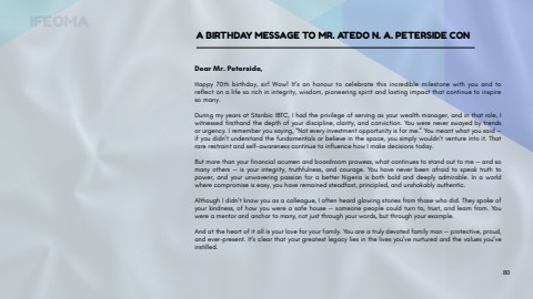 DearMr.Peterside,Happy70thbirthday,sir!Wow!It%u2019sanhonourtocelebratethisincrediblemilestonewithyouandtoreflectonalifesorichinintegrity,wisdom,pioneeringspiritandlastingimpactthatcontinuetoinspiresomany.DuringmyyearsatStanbicIBTC,Ihadtheprivilegeofservingasyourwealthmanager,andinthatrole,Iwitnessedfirsthandthedepthofyourdiscipline,clarity,andconviction.Youwereneverswayedbytrendsorurgency.Irememberyousaying,%u201cNoteveryinvestmentopportunityisforme.%u201dYoumeantwhatyousaid%u2014ifyoudidn%u2019tunderstandthefundamentalsorbelieveinthespace,yousimplywouldn%u2019tventureintoit.Thatrarerestraintandself-awarenesscontinuetoinfluencehowImakedecisionstoday.Butmorethanyourfinancialacumenandboardroomprowess,whatcontinuestostandouttome%u2014andsomanyothers%u2014isyourintegrity,truthfulness,andcourage.Youhaveneverbeenafraidtospeaktruthtopower,andyourunwaveringpassionforabetterNigeriaisbothboldanddeeplyadmirable.Inaworldwherecompromiseiseasy,youhaveremainedsteadfast,principled,andunshakablyauthentic.AlthoughIdidn%u2019tknowyouasacolleague,Ioftenheardglowingstoriesfromthosewhodid.Theyspokeofyourkindness,ofhowyouwereasafehouse%u2014someonepeoplecouldturnto,trust,andlearnfrom.Youwereamentorandanchortomany,notjustthroughyourwords,butthroughyourexample.Andattheheartofitallisyourloveforyourfamily.Youareatrulydevotedfamilyman%u2014protective,proud,andever-present.It%u2019sclearthatyourgreatestlegacyliesinthelivesyou%u2019venurturedandthevaluesyou%u2019veinstilled.ABIRTHDAYMESSAGETOMR.ATEDON.A.PETERSIDECONIFEOMA80