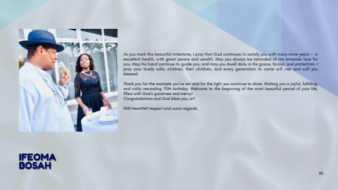 Asyoumarkthisbeautifulmilestone,IpraythatGodcontinuestosatisfyyouwithmanymoreyears%u2014inexcellenthealth,withgreatpeaceandwealth.MayyoualwaysberemindedofHisimmenseloveforyou.MayHishandcontinuetoguideyou,andmayyoudwelldailyinHisgrace,favour,andprotection.Iprayyourlovelywife,children,theirchildren,andeverygenerationtocomewillriseandcallyoublessed.Thankyoufortheexampleyou%u2019vesetandforthelightyoucontinuetoshine.Wishingyouajoyful,fulfilling,andrichlyrewarding70thbirthday.Welcometothebeginningofthemostbeautifulperiodofyourlife,filledwithGod%u2019sgoodnessandmercy!CongratulationsandGodblessyou,sir!Withheartfeltrespectandwarmregards,IFEOMABOSAH81