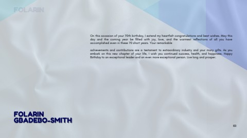 Onthisoccasionofyour70thbirthday,Iextendmyheartfeltcongratulationsandbestwishes.Maythisdayandthecomingyearbefilledwithjoy,love,andthewarmestreflectionsofallyouhaveaccomplishedeveninthese70shortyears.Yourremarkableachievementsandcontributionsareatestamenttoextraordinaryindustryandyourmanygifts.Asyouembarkonthisnewchapterofyourlife,Iwishyoucontinuedsuccess,health,andhappiness.HappyBirthdaytoanexceptionalleaderandanevenmoreexceptionalperson.Livelongandprosper.FOLARINGBADEBO-SMITH83FOLARIN