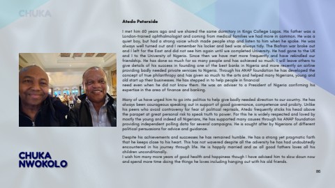 AtedoPetersideImethim60yearsagoandwesharedthesamedormitoryinKingsCollegeLagos.HisfatherwasaLondon-trainedophthalmologistandcomingfrommedicalfamilieswehadmoreincommon.Hewasaquietboy,buthadastrongvoicewhichmadepeoplestopandlistentohimwhenhespoke.HewasalwayswellturnedoutandIrememberhislockerandbedwasalwaystidy.TheBiafranwarbrokeoutandIleftfortheEastanddidnotseehimagainuntilwecompletedUniversity.HehadgonetotheUKandItotheUniversityofNigeria.Sincethenwehavemetmorefrequentlyandhaverekindledourfriendship.Hehasdonesomuchforsomanypeopleandhasachievedsomuch.IwillleaveotherstogivedetailsofhissuccessinfoundingoneofthebestbanksinNigeriaandmorerecentlyanairlineprovidingbadlyneededprivateservicestoNigeria.ThroughhisANAPfoundationhehasdevelopedtheconceptoftruephilanthropyandhasgivensomuchtotheartsandhelpedmanyNigerians,youngandoldstartuptheirbusinesses.Hehassteppedintohelppeopleinfinancialneedevenwhenhedidnotknowthem.HewasanadvisertoaPresidentofNigeriaconfirminghisexpertiseintheareaoffinanceandbanking.Manyofushaveurgedhimtogointopoliticstohelpgivebadlyneededdirectiontoourcountry.Hehasalwaysbeencourageousspeakingoutinsupportofgoodgovernance,competenceandprobity.Unlikehispeerswhoavoidcontroversyforfearofpoliticalreprisals,Atedofrequentlystickshisheadabovetheparapetatgreatpersonalrisktospeaktruthtopower.ForthisheiswidelyrespectedandlovedbymostlytheyoungandindeedallNigerians,HehassupportedmanycausesthroughhisANAPfoundationprovidingindependentpollingdataforseveralcampaigns.HeissoughtafterbyNigeriansofdifferentpoliticalpersuasionsforadviceandguidance.CHUKADespitehisachievementsandsuccesseshehasremainedhumble.Hehasastrongyetpragmaticfaiththathekeepsclosetohisheart.Thishasnotwavereddespitealltheadversityhehashadundoubtedlyencounteredinhisjourneythroughlife.Heishappilymarriedandasallgoodfatherslovesallhischildrenunconditionally.IwishhimmanymoreyearsofgoodhealthandhappinessthoughIhaveadvisedhimtoslowdownnowandspendmoretimedoingthethingshelovesincludinghangingoutwithhisoldfriends.CHUKANWOKOLO86