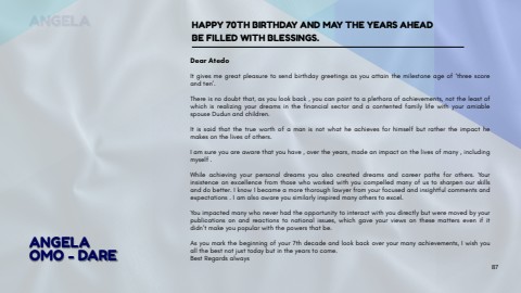 HAPPY70THBIRTHDAYANDMAYTHEYEARSAHEADBEFILLEDWITHBLESSINGS.ANGELADearAtedoItgivesmegreatpleasuretosendbirthdaygreetingsasyouattainthemilestoneageof%u2018threescoreandten%u2019.Thereisnodoubtthat,asyoulookback,youcanpointtoaplethoraofachievements,nottheleastofwhichisrealizingyourdreamsinthefinancialsectorandacontentedfamilylifewithyouramiablespouseDudunandchildren.Itissaidthatthetrueworthofamanisnotwhatheachievesforhimselfbutrathertheimpacthemakesonthelivesofothers.Iamsureyouareawarethatyouhave,overtheyears,madeanimpactonthelivesofmany,includingmyself.Whileachievingyourpersonaldreamsyoualsocreateddreamsandcareerpathsforothers.Yourinsistenceonexcellencefromthosewhoworkedwithyoucompelledmanyofustosharpenourskillsanddobetter.IknowIbecameamorethoroughlawyerfromyourfocusedandinsightfulcommentsandexpectations.Iamalsoawareyousimilarlyinspiredmanyotherstoexcel.Youimpactedmanywhoneverhadtheopportunitytointeractwithyoudirectlybutweremovedbyyourpublicationsonandreactionstonationalissues,whichgaveyourviewsonthesemattersevenifitdidn%u2019tmakeyoupopularwiththepowersthatbe.Asyoumarkthebeginningofyour7thdecadeandlookbackoveryourmanyachievements,Iwishyouallthebestnotjusttodaybutintheyearstocome.BestRegardsalwaysANGELAOMO-DARE87