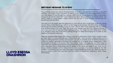 BIRTHDAYMESSAGETOATEDOLLOYDHappybirthdayAtedoNariAtowariPeterside(CON).ItiswithaverygladheartthatIamsendingthismessage.Iamhappytobeinapositiontoreflectonyourimpactonsomanypeopleincludingme.IhavehadreasonstothinkthroughhowworkinginIBTCandthevariousphaseshasbeenatremendousblessingtomeandthevaluesthatIhaveimbibedasaresult.Havingsomeoneconsistentlymentorandteachateamofyoungbankersweeklywithoutfailwassuchamind-mouldingexercisethatthebenefitscanneverbelisted.VeryearlyoninmycareerIhadtheopportunitytoworkwithyouandIwouldneverforgetyoucomingintotheofficeonSaturdaytoworkwithmeonthebudgetasanexample.TheCEOsittingacrossmetotalkthroughtheprocesswastellingtosaytheleast.LessonsIlearntfrominteractingwithyoudirectlyhaveremainedlessonsthathavestuck.Youwouldstatecategoricallythat%u201cyoursignaturebelongstoyou%u201dsoyoumusttakefullresponsibilityforsigninganything.Youtaughtmetobeindependentmindedinmythoughtprocessandtobeboldinpushingthroughmyideas(encouragingmetospeakupandspeakoutwaslearnedunderyou).TherearenumerousotherlessonsthatcometomindbutinreflectingonthemIthinkIwouldonedayputthemdowninamoreelaborateway.ThinkingbackalsoIhavenotseenabetterbankerwithaknackforsolidgovernanceprocessandstructure.YouareanexampletobeemulatedandbeingasticklerforsuperiorgovernancestandardshasenabledmetonavigatevariousassignmentsIhaveencounteredinlifeandinthevariousrolesIhaveplayed.Lastly,IamhappythatyouhaveraisedsomanyotherCE%u2019sandManagingdirectors,somebeingentrepreneursontheirownbutnonehascomeupwithareputationthatisquestionableandthisspeakstothevaluesyoutaughtusall.Thankyouforbeingaleaderofleadersandfortakingtimetoinvestinsomanyofus.Asyoucelebratethis70thbirthday,Iwouldliketoprayformanymoreyearsinsoundhealthandjoyforyou.ThankyoualsoforgivingusaccesstoMrsPandmayGodcontinuetoblessherbeyondherimagination.Amen.HappyLLOYDESEOSA70thbirthday.ONAGHINON88