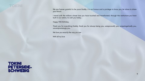 WeareforevergratefultobeyoursDaddy.Itisanhonourandaprivilegetoknowyou,letalonetoshareyourblood.Istandwiththemillionswhoselivesyouhavetouchedandtransformed,throughtheinstitutionsyouhavebuiltinournation,towishyoutoday%u2026Happy70thBirthday.ThankyouforeverythingDaddy,thankyouforalwaysbeingyou,unequivocallyyou,unapologeticallyyou,uncompromisinglyyou.Weloveyouexactlythewayyouare.WithallmyloveTOKINIPETERSIDESCHWEBIG9TOKINI