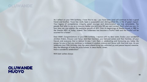 AsIreflectonyour70thbirthday,Ihavethistosay-youhavebeen(andwillcontinuetobe)agoodfriendandbrother.Yourshasreallybeenapurposefulanddistinguishedlife,alifeofgreatimpact.Yourlegacyofcompetence,integrity,greatcourageanddeterminationaretrulyremarkable.Thepeoplethatrefertoyouasavisionaryleaderaredefinitely100percentcorrect,that%u2019swhatyouare.OrhowelsecanoneexplaintheexplosivegrowthofIBTCfromitsbeginningsatWesleyHousein1989totheStanbicIBTCoftoday.Indeed%u201cthewildernesshasbecomeafruitfulfieldandthefruitfulwillbecountedforaforest%u201d.DearANAP,Congratulationsonyour70thbirthday.Irejoicewithmydearsister,Dudun.yourwonderfulchildren(Tokini,AtowariandTariyeandtheirfamilies),yourbelovedsistersandtheirfamilies,allyourfriendsandeveryonethatisrelatedtoyou.Ijointhemincelebratingandhonouringyoutoday.Myprayerforyouisthatyoucontinuetoincreaseinwisdom,statureandfavourwithGodandman.Asyoucelebrateyour70thbirthday,maytheyearsaheadbringyouunlimitedjoyandpeacebeyondmeasure.Maytheblessingsoftodaybeyoursforever.InJesusName.Amen.Haveawonderfulcelebration!WithbestwishesalwaysOLUWANDEMUOYO90OLUWANDE