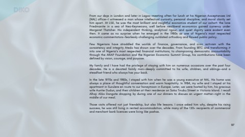 FromourdaysinLondonandlaterinLagos%u2014meetingoftenforlunchathisNigerianAcceptancesLtd(NAL)office%u2014Iwitnessedamanwhoseintellectualcuriosity,personaldiscipline,andmoralclaritysethimapart.AtLSE,hewasthemostbrilliantandinsightfuleconomicsstudentofourcohort:theloneFriedmaniteinaseaofNeo-Keynesians,wellbeforeneoliberaleconomicsgainedcurrencyunderMargaretThatcher.Hisindependentthinking,analyticalrigour,andquietdignitywereevidenteventhen.Itcameasnosurprisewhenheemergedinthe1980sasoneofNigeria%u2019smostrespectedeconomiccommentators%u2014fearlesslychallengingoutdatedorthodoxyandflawedpublicpolicy.FewNigerianshavestraddledtheworldsoffinance,governance,andcivicactivismwiththeconsistencyandintegrityAtedohasshownoverthedecades.FromfoundingIBTCandtransformingitintooneofNigeria%u2019smostrespectedfinancialinstitutions,tochampioningdemocraticaccountabilitythroughtheANAPFoundationandtheNigerianEconomicSummitGroup,hiscontributionshavebeendefinedbyvision,courage,andpurpose.MyfamilyandIhavehadtheprivilegeofstayingwithhimonnumerousoccasionsoverthepastfourdecades.Heisadevotedfamilyman%u2014deeplycommittedtohiswife,children,andsiblings%u2014andasteadfastfriendwhoalwayshasyourback.Inthelate1970sand1980s,IstayedwithhimwhenhewasayoungexecutiveatNAL.Hishomewasalwaysaplaceofthoughtfulconversationandwarmhospitality.In1984,mywifeandIstayedathisapartmentinSurulereenroutetoourhoneymooninEurope.Later,wewerehostedbyhim,hisgraciouswifeAuntieDudun,andtheirchildrenattheirresidenceonSakaTinubuStreetinVictoriaIsland.IrecallAlhajiAlikoDangotedroppingbyduringoneofourdinnerstodiscussanurgentmatter%u2014rightinthemiddleofourmeal.Thosevisitsofferednotjustfriendship,butalsolifelessons.Ionceaskedhimwhy,despitehisrisingsuccess,hewasstilllivinginrentedaccommodation,whilemanyofthe120+recipientsofcommercialandmerchantbanklicenceswerelivinglikepashas.DIKO97