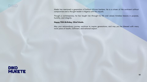 AtedohasmentoredagenerationofbrilliantAfricanbankers.HeisacitizenofthecontinentwithoutcompromiseandathoughtleaderinNigeriawithfewequals.Thoughacontemporary,hehastaughtme%u2014throughhislifeandvalues%u2014timelesslessonsinpurpose,humility,andintegrity.Happy70thBirthday,ChiefAtedo.Mayyourextraordinaryjourneycontinuetoinspiregenerations,andmayyoubeblessedwithmanymoreyearsofhealth,fulfilment,andnationalimpact.DIKODIKOMUKETE99